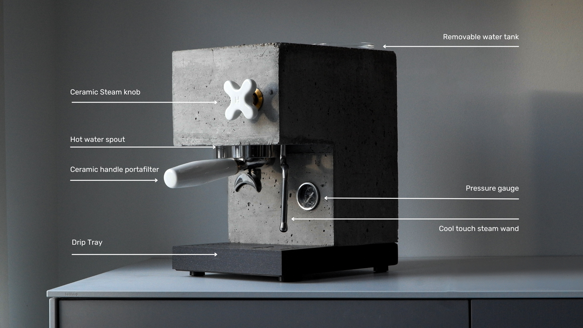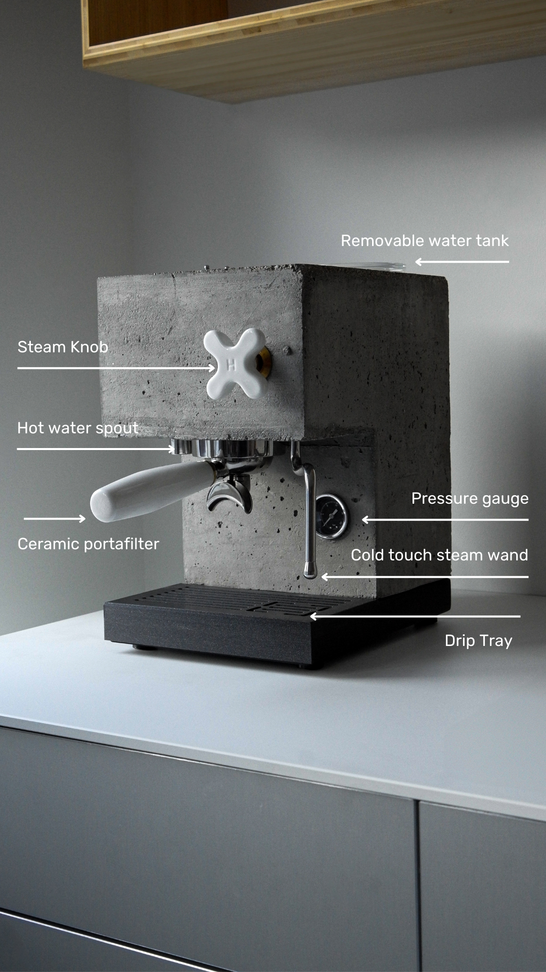 A design statement which also happens to make high-quality, delicious espresso. Made from hand-cast concrete, R2 features porcelain touch-points, matte black powder coated steel and brass highlights.